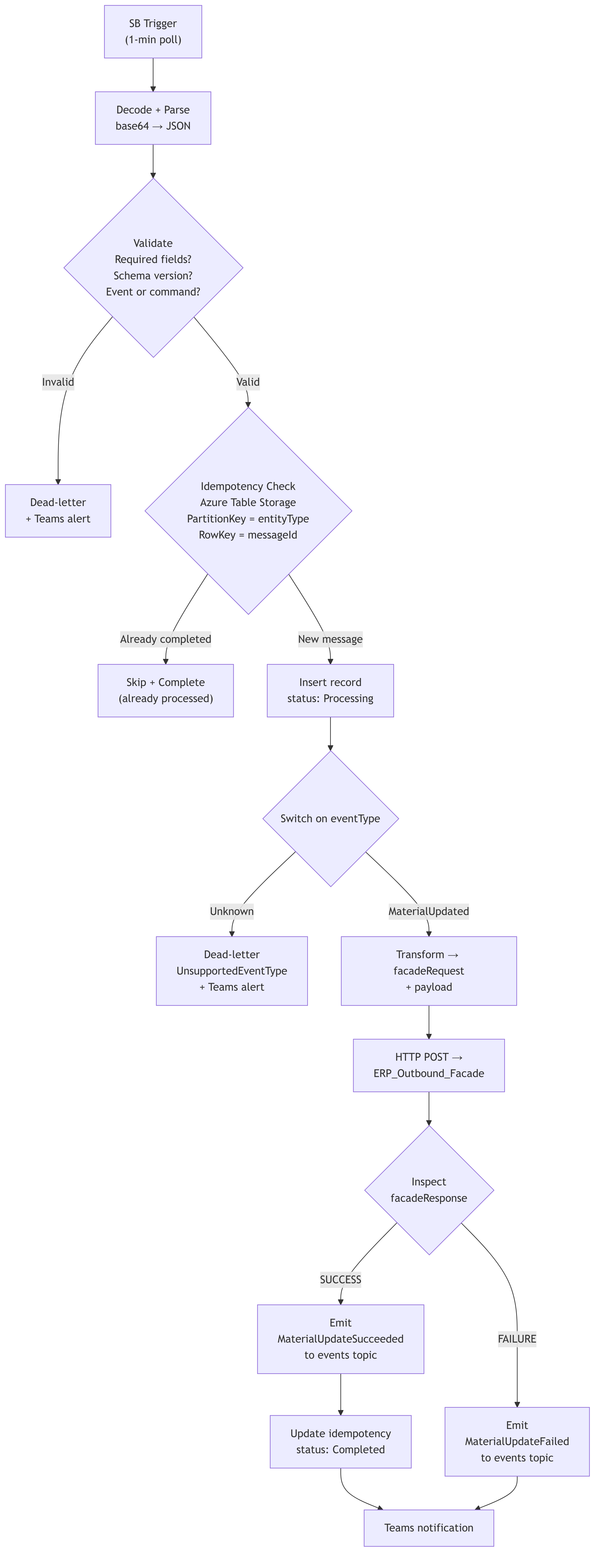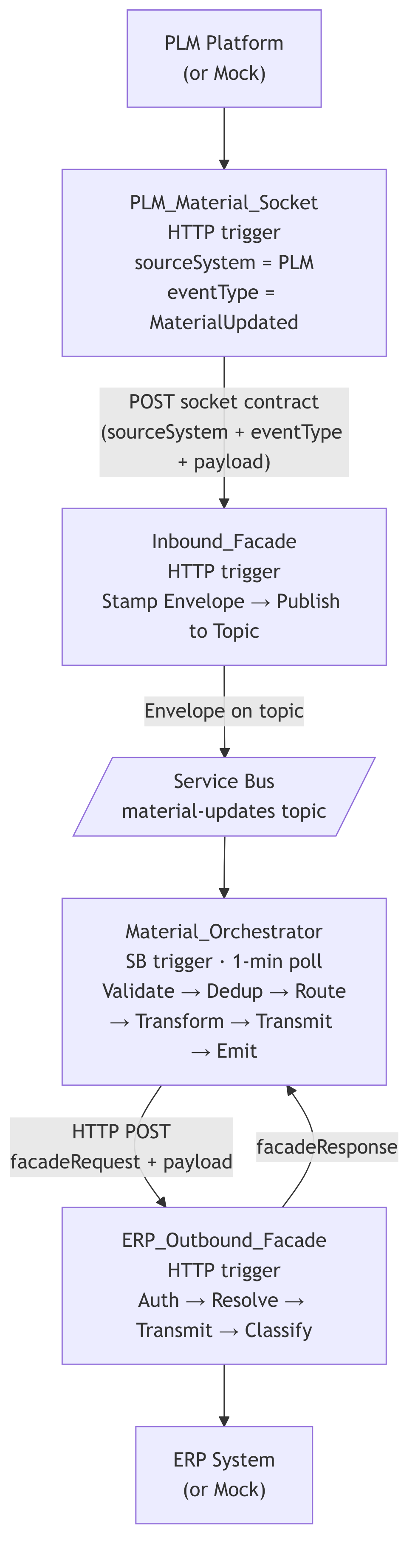 For MaterialUpdated, the orchestrator transforms the envelope into the outbound facade’s contract: