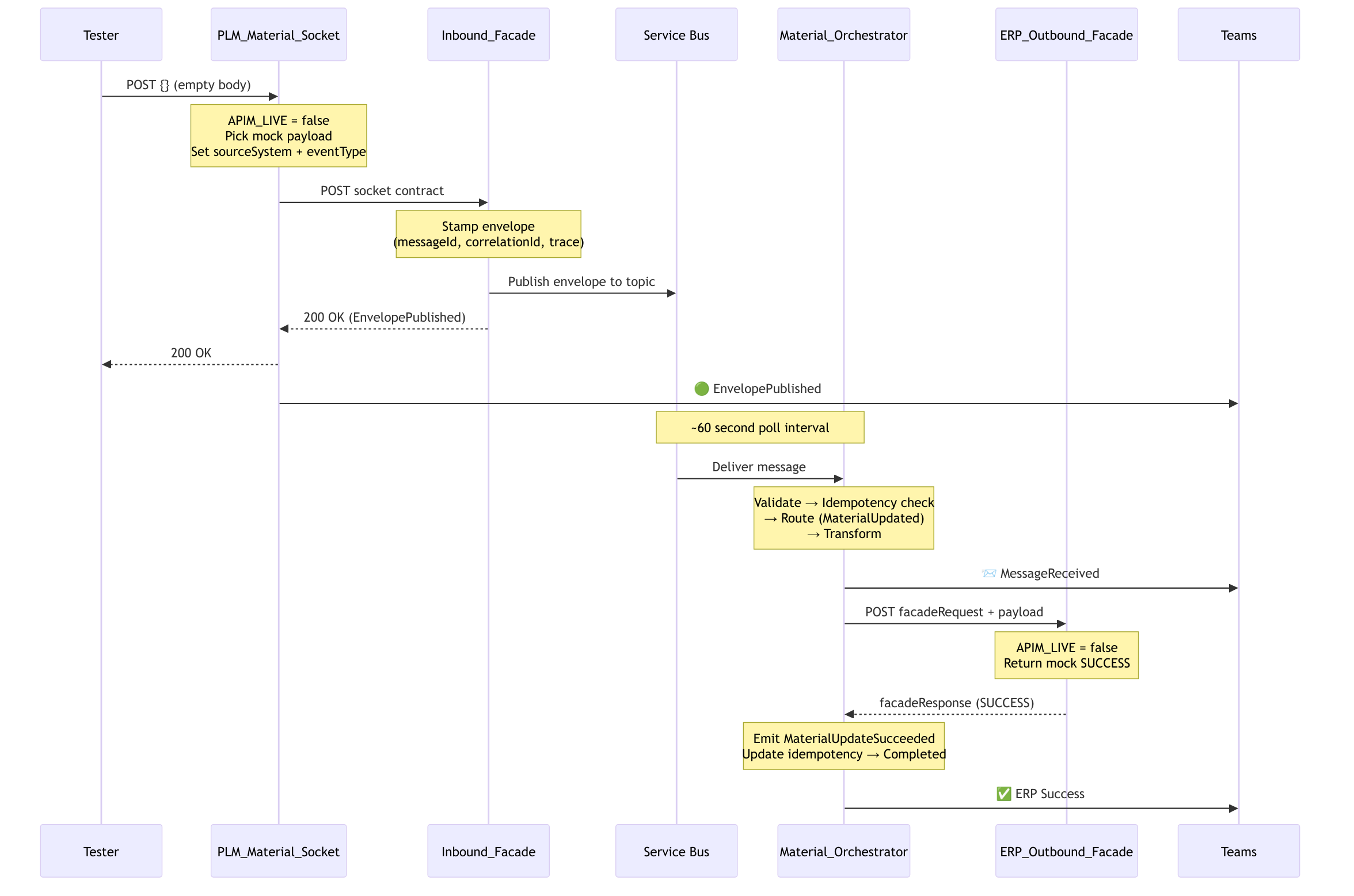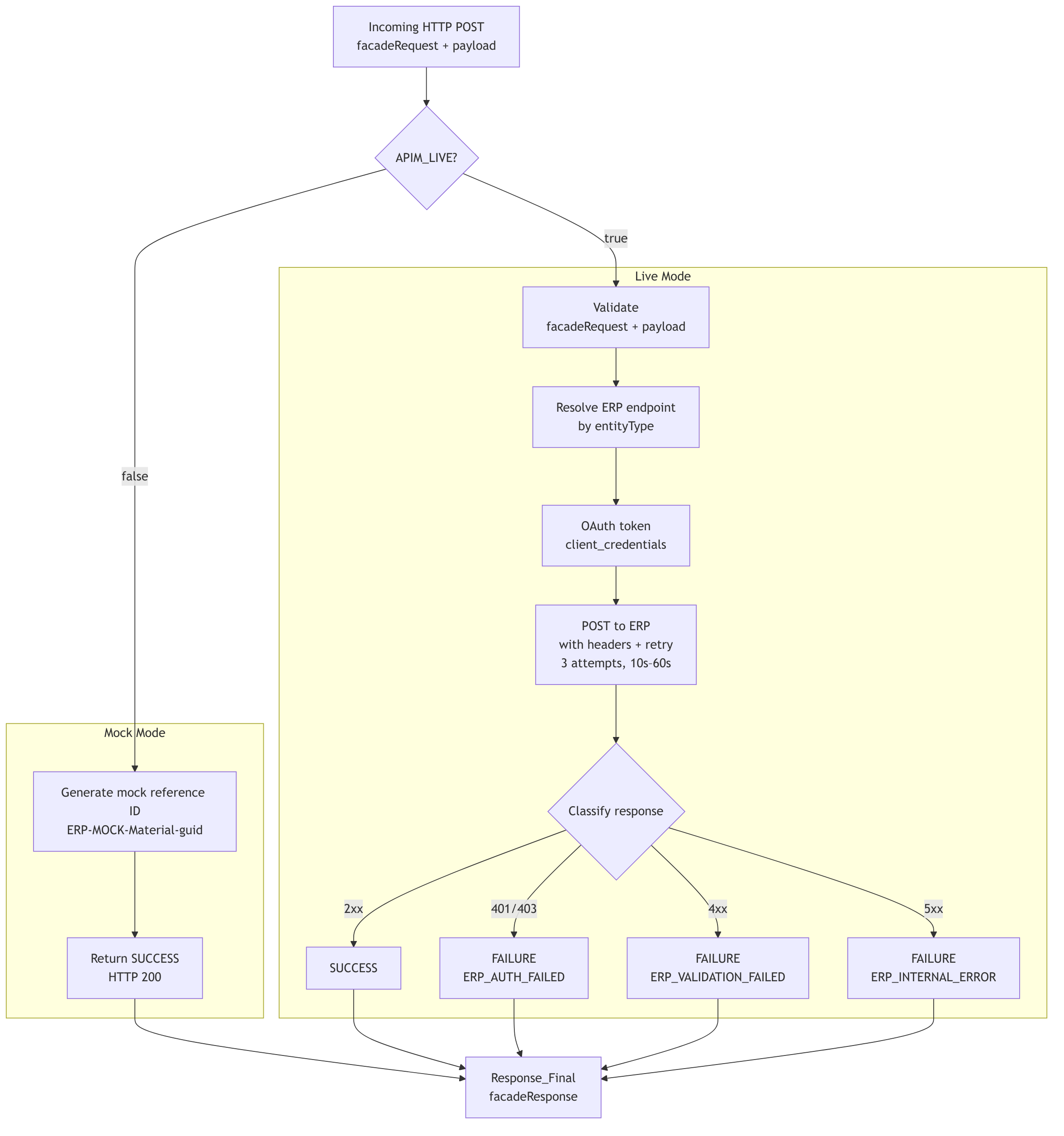 Mock mode (APIM_LIVE = false): Skips auth and the ERP call entirely. Generates a mock external reference ID (ERP-MOCK-Material-{guid}), returns SUCCESS with HTTP 200.