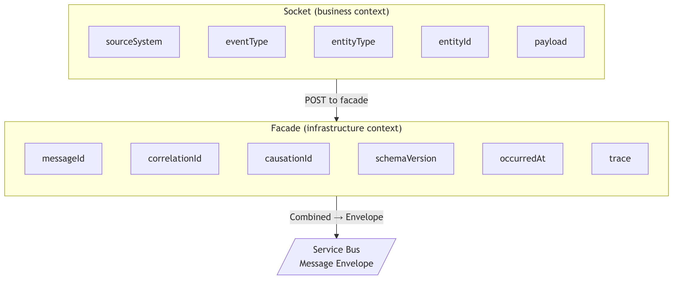 The facade doesn’t know or care which socket called it. It doesn’t inspect the payload. It doesn’t validate business rules. It stamps metadata and publishes. This is Hohpe and Woolf’s Messaging Gateway in its purest form, the caller (the socket) speaks HTTP with a known contract, and the consumer (the orchestrator) speaks envelopes on Service Bus. The facade translates between them.